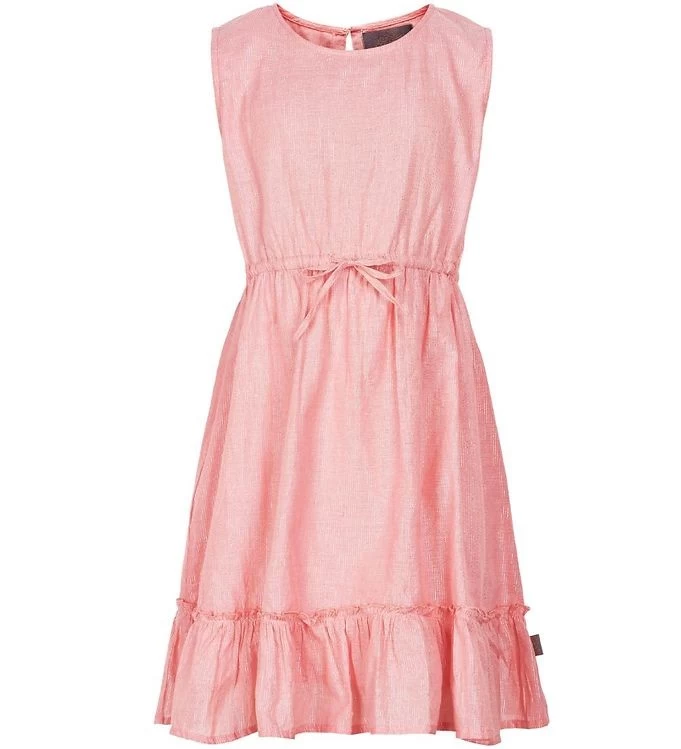 Hübsches Creamie Sommerkleid in zartem rosa mit silbernen Lurexstreifen.. Das luftige Kleidchen hat kleine Fältchen an der Taille, Rüschen-Flügelärmel und es schwingt schön. Der Baumwollstoff ist ganz weich und kratzt überhaupt nicht. Das ideale Sommerkleid für schönes Wetter.