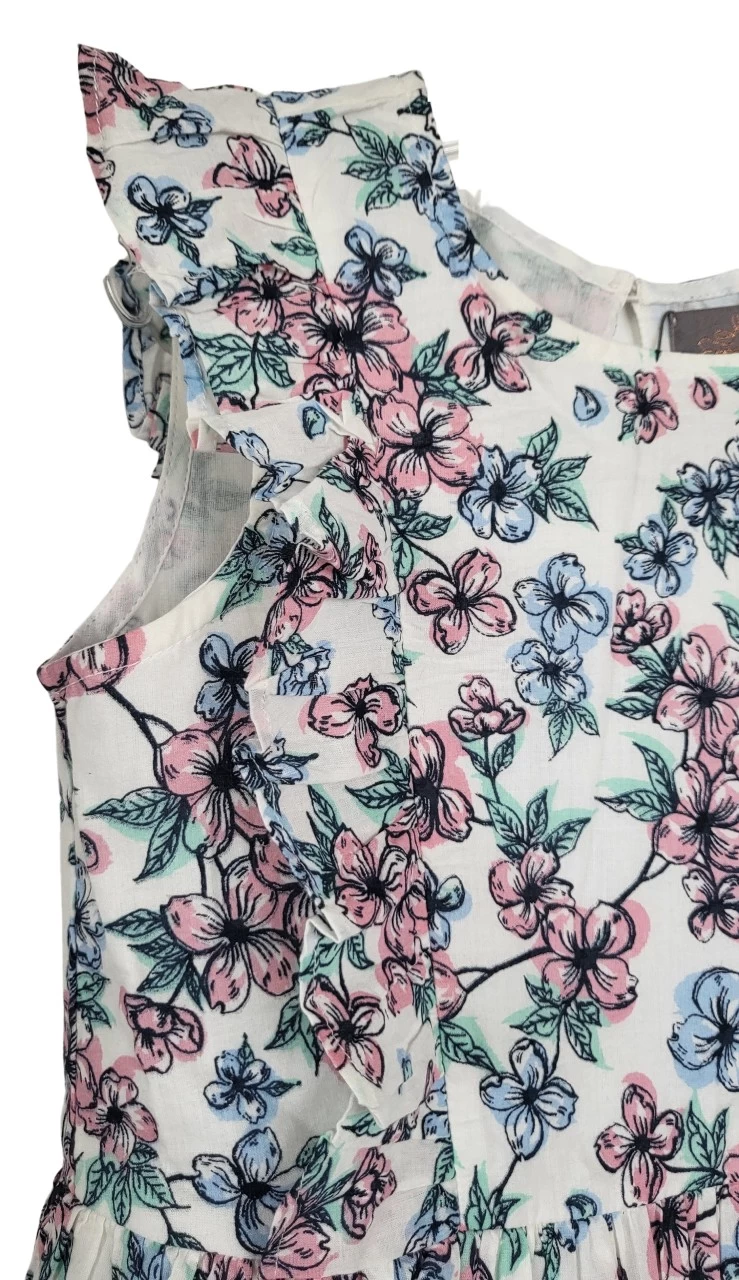 Hübsches Sommerkleid in cremeweiß mit Blumendruck. Das Baumwollkleid hat am Oberteil seitlich hübsche Rüschen. Der luftige Baumwollstoff ist weich und kratzt überhaupt nicht. Das ideale Sommerkleid für schönes Wetter.
