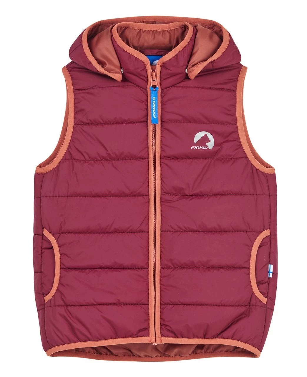 Die praktische ärmellose Thermo Steppweste Vanuli von FINKID ist perfekt, wenn die Temperaturen im Herbst und Winter schwanken. Das atmungsaktive Obermaterial ( hergestellt aus recyceltem Polyester) und die Kapuze wärmen Bauch, Kopf und Rücken an milderen Tagen. Wenn es draußen dann kalt und frostig wird, lässt sich die Vanuli als eingezippte Weste oder zusätzliche Isolations-Zwischenschicht einsetzen. Die gesteppte Wattierung hält die Wärme am Körper, und enthält keine Daunen. Ideal als wärmende Zwischenjacke beim “Zwiebelprinzip” für Waldkinder.