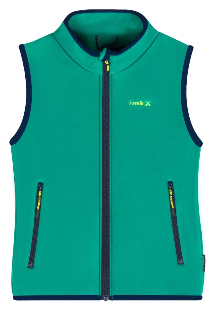 Die Kamik Kinder Fleeceweste aus der Waldhüpfer Kollektion ist sehr bequem, atmungsaktiv und winddicht. Sehr gut geeinet für die Übergangszeit oder als Unterzieh-Weste im Winter. An kühlen windigen Tagen im Waldkindergarten und in der Überganszeit ist die Kinder-Fleeceweste das ideale Kleidungsstück. Einfach über das Shirt oder über den Pulli ziehen, und schon kann der Wind nicht mehr durchpfeifen. Die Körper-Kernzone an Bauch und Rücken ist vor Zugluft geschützt, und wird schön warm gehalten. Der Reißverschluß ist leichtgängig, läuft ganz weit nach oben und hat einen Kinnschutz. Die elastischen Einsätze sorgen für einen guten Sitz.
