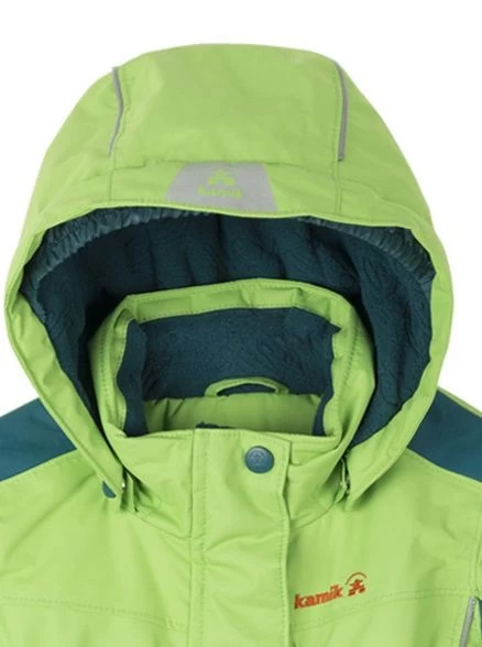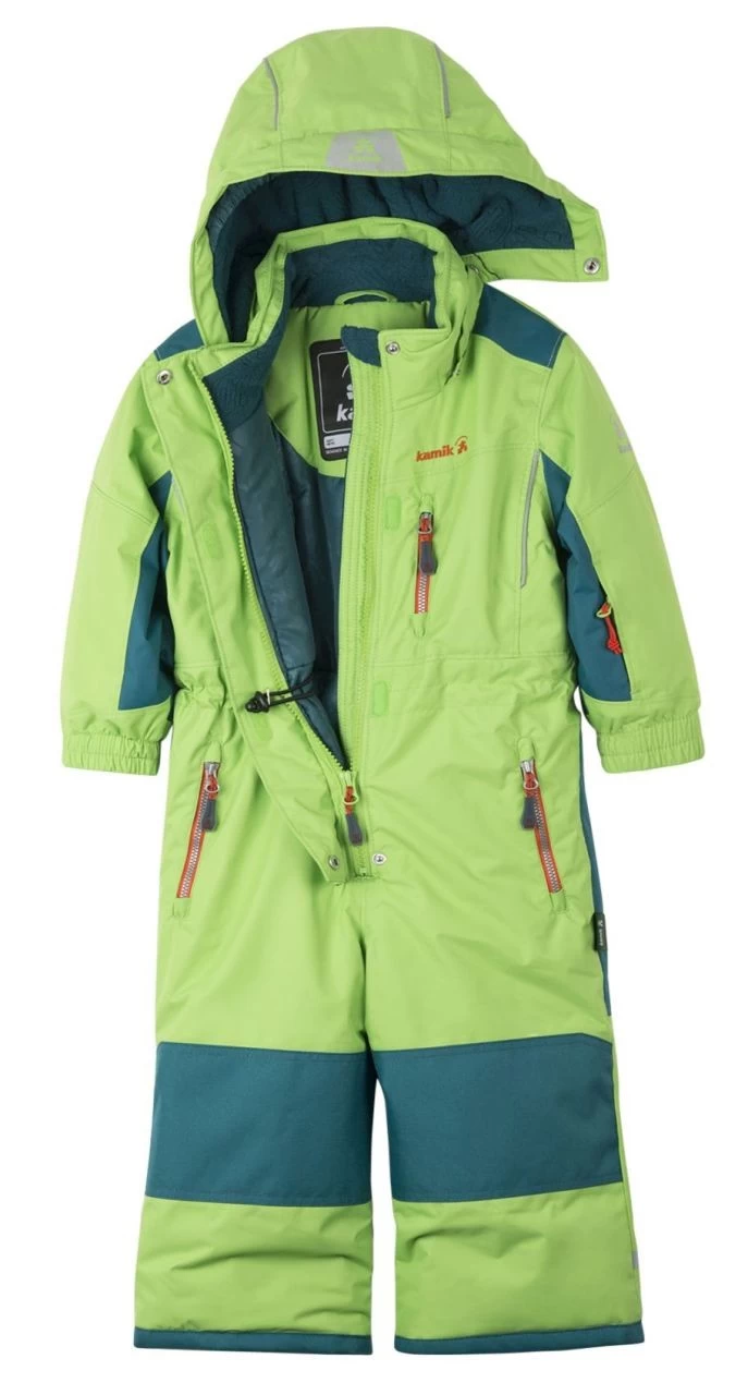 Der stylische Skioverall besticht durch die tolle Farbkombi von leuchtendem limegreen mit dunkelgrün. Der robuste Skianzug von Kamik ist strapazierfähig, wasserdicht und atmungsaktiv. Der bequeme Schnitt und das hohe Wärme-Rückhaltevermögen machen den Ski-Overall schnell zu einem Lieblingskleidungsstück im Winter. Idealer Outdoor-Overall für die kalte Jahreszeit. Winddicht, kuschelwarm und sehr hochwertig verarbeitet mit vielen nützlichen Details. Die zuverlässige Wasserdichtigkeit der Außenseite wird durch die spezielle BIONIC-Finsih Eco Beschichtung erreicht. Diese wasserabweisende Imprägnierung ist ökologisch und basiert auf einer fluorfreien Rezeptur. Sehr gut geeignet zum Skifahren, zum Schneeburgen bauen, Schlitten fahren und für den Waldkindergarten. Der Kamik Skianzug Lazer schützt Kinder bei Outdooraktivitäten und Wintersport zuverlässig vor Matsch, Schnee, Wind und Kälte