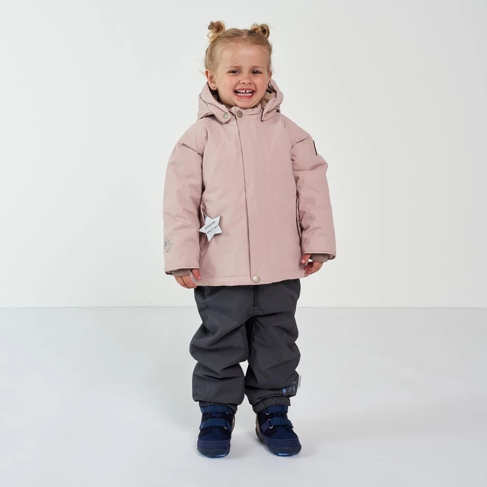 Unisex-Winterjacke. 100 % wind- und wasserdicht, atmungsaktiv und warm genug für einen sehr kalten Winter. Wird vorne durch einen verdeckten, schrägen Reißverschluss geöffnet. Die Kapuze ist abnehmbar und kann mit einer elastischen Kordel angepasst werden, um den Wind draußen zu halten. Innen lässt sich die Taille verstellen. Die Schneemanschetten am Handgelenk lassen die Daumen raus. Größen bis einschließlich Größe 86 cm (18 m) haben eine Rippe um den Hals, während die größeren Größen einen normalen Kragen haben. Süßer Animal-Print am unteren Saum der Jacke