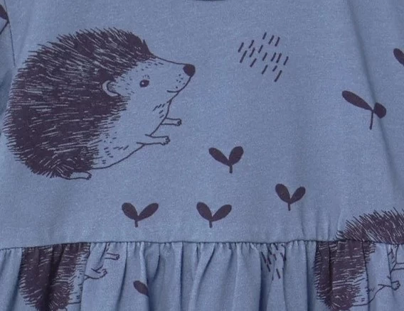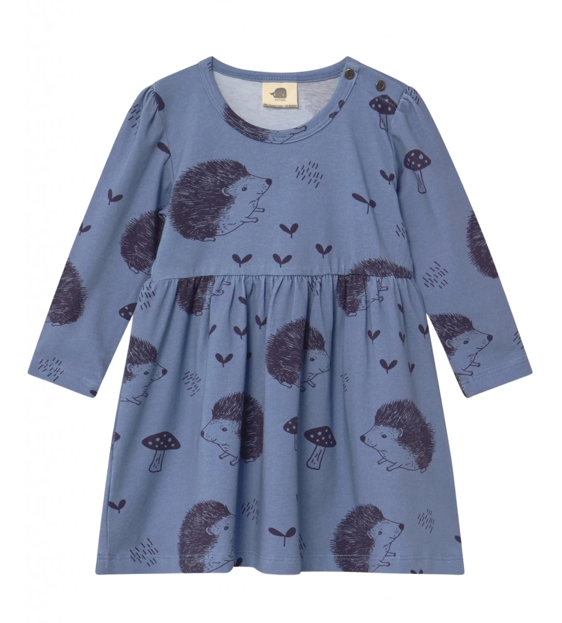 Bequemes Walkiddy Mädchenkleid in jeansblau mit Igel-Motiv. Das Material ist Bio-Baumwolle , kontrolliert biologischer Anbau, “Organic” gem. GOTS lizenziert ( Liz. Nr. USB TEX2729)
