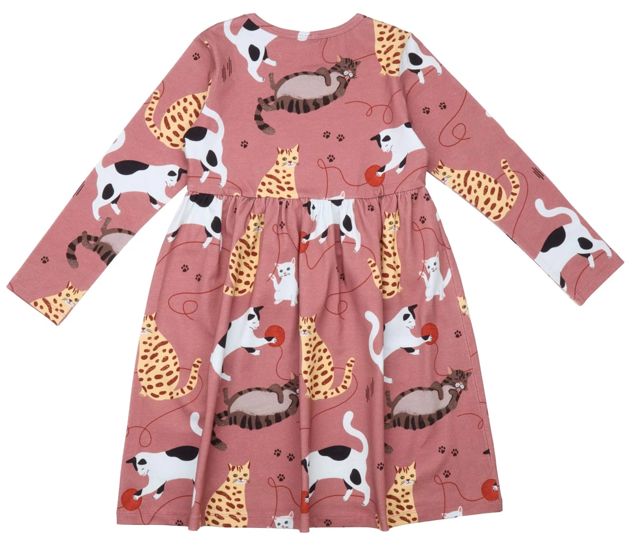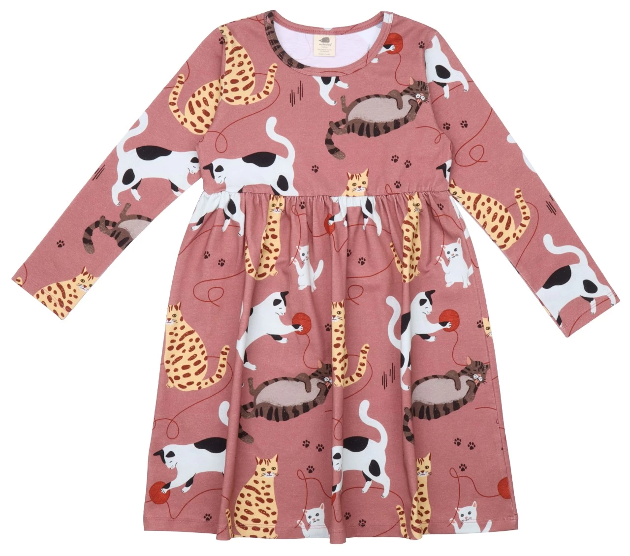 Bequemes Walkiddy Mädchenkleid in darkrose mit süßen Katzen. Das Material ist Bio-Baumwolle , kontrolliert biologischer Anbau, “Organic” gem. GOTS lizenziert ( Liz. Nr. USB TEX2729)